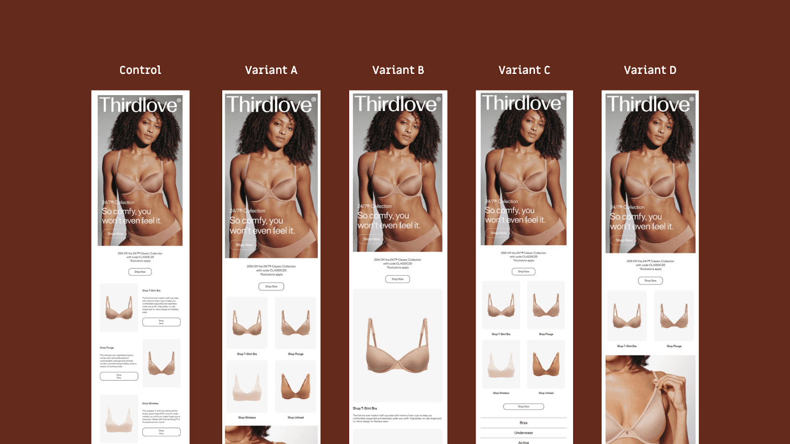 Like most high-performing DTC brands, Thirdlove already segmented its audience intelligently based on engagement, purchase history, and lifecycle stage. But each promotional campaign still involved sending a single, uniform email template to large audience groups. The team wondered if certain customers might be predisposed to engage or convert on different layouts, tones, or visual structures.