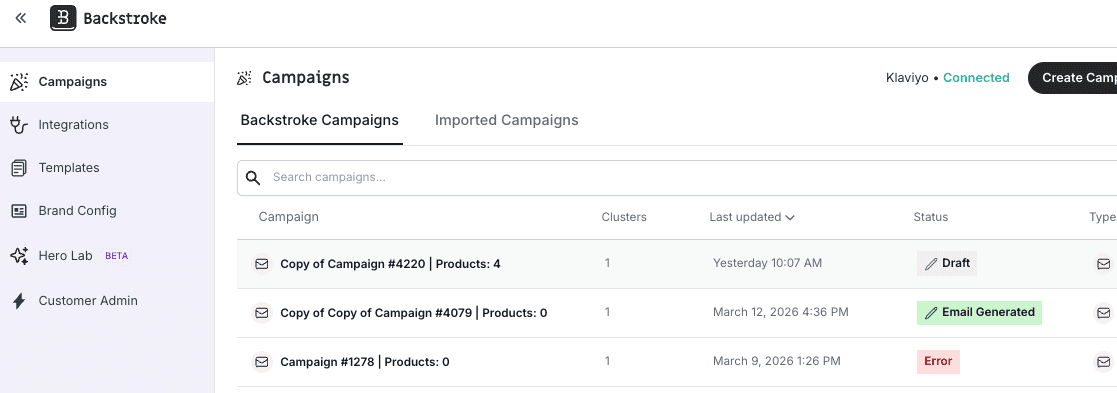 After: Just click the row. Clicking any campaign row now takes you straight to the right place — the builder for drafts, the review screen for generated campaigns, and so on. The three-dot menu is still there for secondary actions like duplicating, archiving, or scheduling. Rows that don't have a natural destination (like already-sent campaigns) stay as they are — no confusing dead clicks.