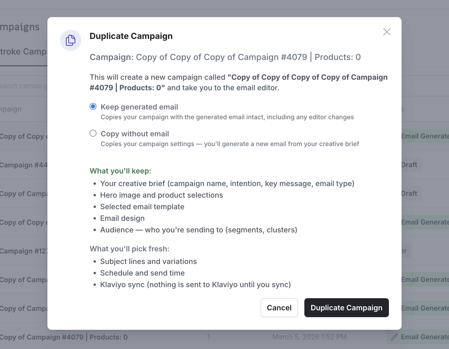 Before, duplicating a campaign always started you over from scratch. Any edits you'd made in the editor — swapped images, updated links, approved body copy — were thrown away. The duplicate reverted to the original generated output, which meant redoing all your work if you just wanted a quick copy with minor tweaks. This was especially painful if you'd already gotten copy approved and synced to Klaviyo, then needed to go back and make a correction.